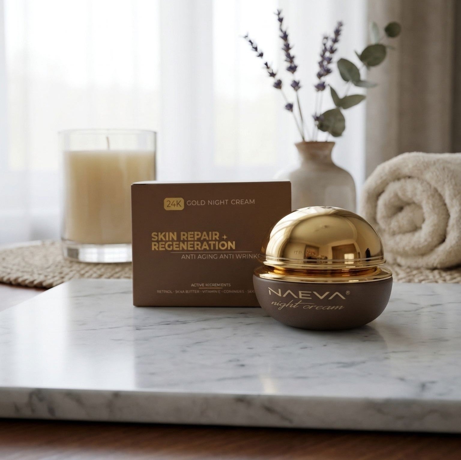 Descritpion: Boost your skin's natural repair process with NAEVA 24K Gold Night Cream. Our unique formula includes Retinol, Vitamin E, Collagen, and Ceramides, all scientifically proven to restore and rejuvenate skin. And with the added benefits of 24K gold, you'll be sure to achieve a radiant, youthful complexion.